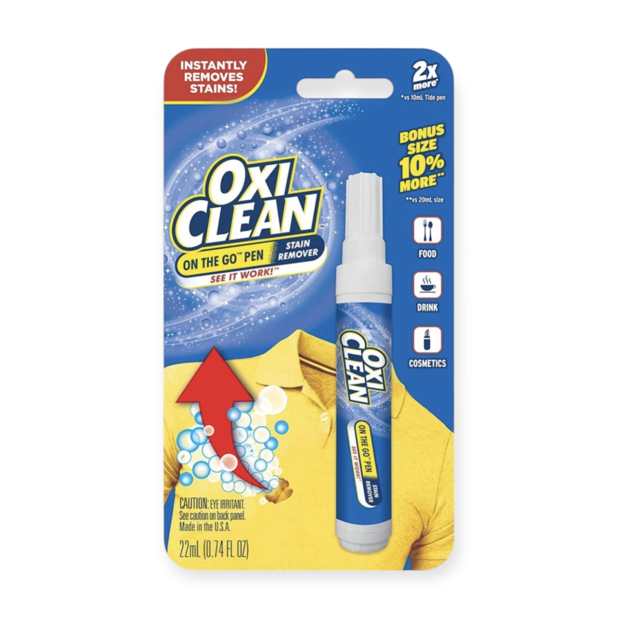 OxiClean on the go stain remover portable pen is specially formulated with the power of oxygen to remove common "on the go” stains like, makeup, lipstick, chocolate, spaghetti, soy sauce and more. OxiClean fast, safe, and effective stain-lifting formula does not contain bleach and is safe to use on most fabrics. The uniquely designed pen applicator has a stain-fighting scrubber tip to help power through stains without damaging clothing.SpecificationsCase Quantity: 12Assortment Details: OxiClean(R) On the Go Stain Remover Portable PenShape: CylinderWidth: 2.7 inHeight: 6 inLength: .7 inWeight: .22 oz